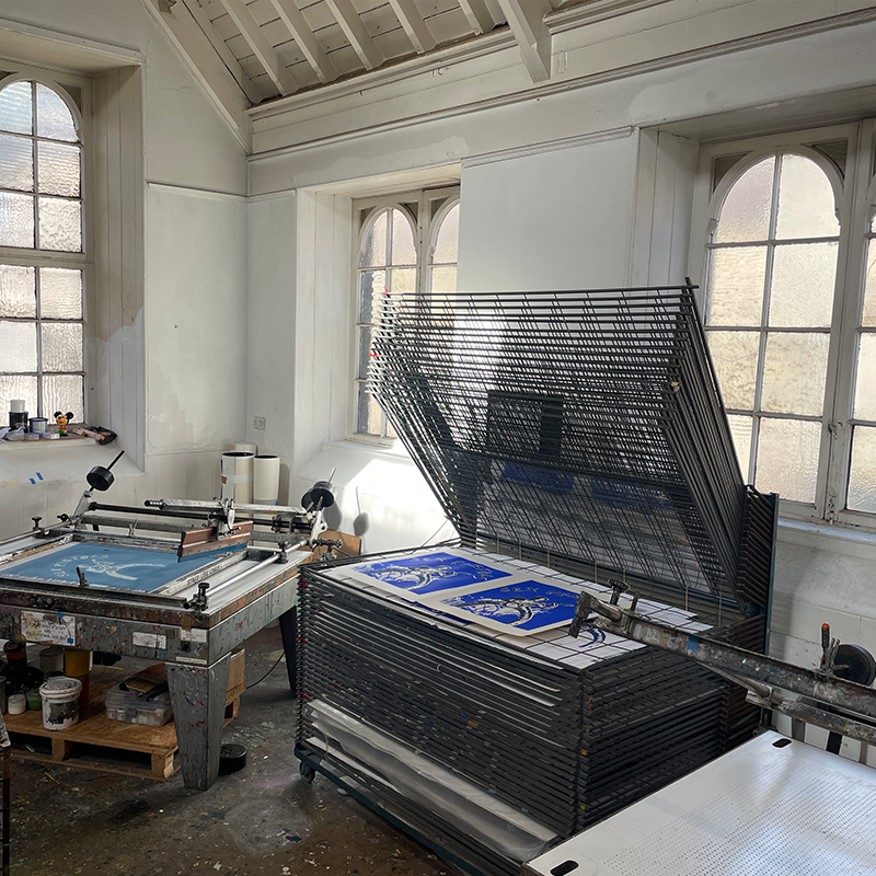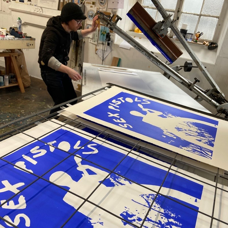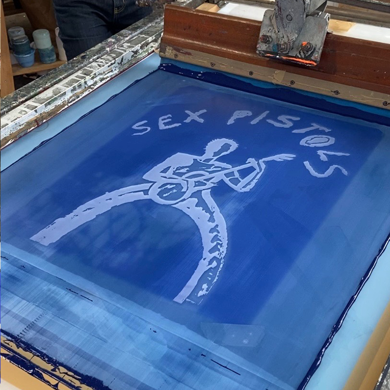 Celebrating 50 years of the Sex Pistols and Peacocks’ printmaking studio, this is a reproduction of the original artwork design with The Sex Pistols by Jamie Reid. Originally made by Jamie in Peacock on a visit to the studio in the 1970's, this image was the first ever image produced by Jamie for the band.